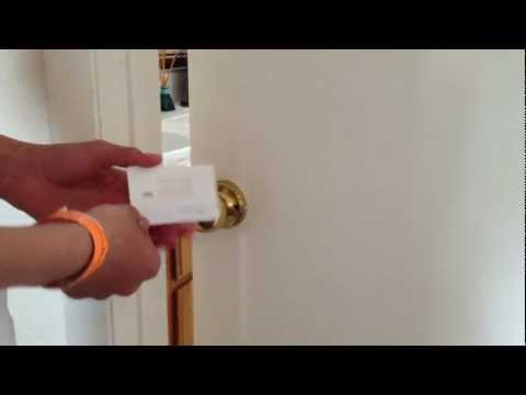Today we showcase a quick and easy way to open a door knob lock with a credit card incase you locked yourself out. To unlock the door shake the card back and forth. Slide the card between the door and the frame.